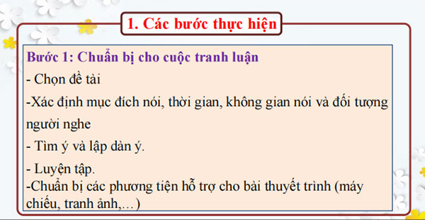 Đề tài: Câu lạc bộ Văn học trường bạn tổ chức buổi hùng biện Tuổi trẻ và những góc nhìn xã hội. Hãy chuẩn bị bài tranh luận về một vấn đề xã hội đáng quan tâm và có những ý kiến trái ngược nhau để tham gia buổi hùng biện. 1. Bước 1: Chuẩn bị cho cuộc tranh luận - Chọn đề tài -Xác định mục đích nói, thời gian, không gian nói và đối tượng người nghe - Tìm ý và lập dàn ý. - Luyện tập. -Chuẩn bị các phương tiện hỗ trợ cho bài thuyết trình (máy chiếu, tranh ảnh,…) |