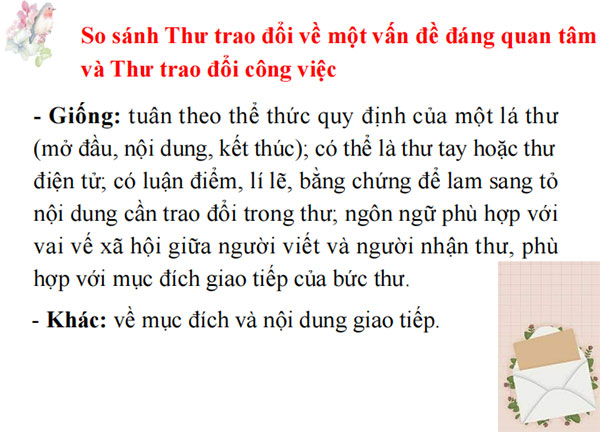 Một số điểm giống và khác nhau giữa Thư trao đổi về một vấn đề đáng quan tâm và Thư trao đổi công việc: - Giống: tuân theo thể thức quy định của một lá thư (mở đầu, nội dung, kết thúc); có thể là thư tay hoặc thư điện tử; có luận điểm, lí lẽ, bằng chứng để lam sang tỏ nội dung cần trao đổi trong thư; ngôn ngữ phù hợp với vai vế xã hội giữa người viết và người nhận thư, phù hợp với mục đích giao tiếp của bức thư. - Khác: về mục đích và nội dung giao tiếp. |