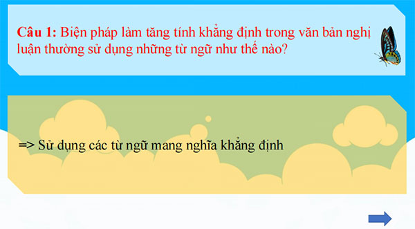 a. Mục tiêu: Huy động kiến thức của HS về một số biện pháp làm tăng tính khẳng định, phủ định trong văn bản nghị luận qua trò chơi “ Bắt bướm”