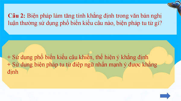 Câu trả lời của HS: Câu 1: Biện pháp làm tăng tính khẳng định trong văn bản nghị luận thường sử dụng các từ ngữ như thế nào? ð Sử dụng các từ ngữ mang nghĩa khẳng định Câu 2: Biện pháp làm tăng tính khẳng định trong văn bản nghị luận thường sử dụng phổ biến kiểu câu nào? Biện pháp tu từ gì? ð Sử dụng phổ biến kiểu câu khiến, thể hiện ý khẳng định ð Sử dụng biện pháp tu từ điệp ngữ nhấn mạnh ý được khẳng định. Câu 3: Biện pháp làm tăng tính phủ định trong văn bản nghị luận thường sử dụng từ ngữ như thế nào? ð Sử dụng các từ ngữ mang nghĩa phủ định và những từ ngữ biểu thị ý nghĩa hạn chế