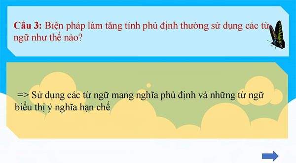 Câu 4: Biện pháp làm tăng tính phủ định trong văn bản nghị luận thường sử dụng kiểu câu nào? ð Sử dụng phổ biến kiểu câu hỏi thể hiện ý nghi ngờ, chất vấn Câu 5: Biện pháp làm tăng tính phủ định trong văn bản nghị luận thường sử dụng từ ngữ như thế nào? ð Sử dụng các danh từ, đại từ thể hiện thái độ đánh giá tiêu cực để chỉ đối tượng bị đả kích |