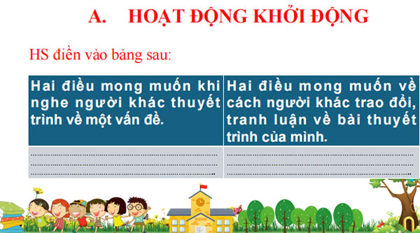 * Thực hiện nhiệm vụ HT: Cá nhân HS thực hiện nhiệm vụ. * Báo cáo, thảo luận: HS trả lời câu hỏi vào bảng phụ, treo lên bảng để cả lớp quan sát. * Kết luận, nhận định: GV tổng kết ý kiến của HS, từ đó dẫn dắt vào bài học: Từ những mong muốn của các em liên quan đến kĩ năng thuyết trình và kĩ năng nhận xét, đánh giá bài thuyết trình, chúng ta sẽ học kĩ hơn về các kĩ năng này trong bài học. |