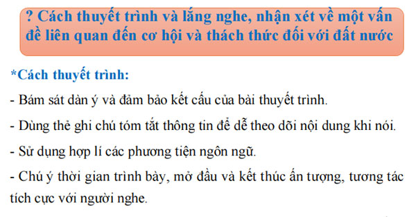 – Nói: Biết thuyết trình về một vấn đề liên quan đến cơ hội và thách thức đối với đất nước.