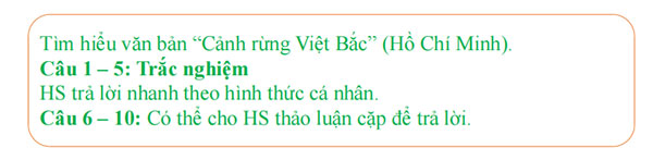 + Năng lực hợp tác khi trao đổi, thảo luận về thành tựu trên các phương diện: cấu tứ; yếu tố tượng trưng; tình cảm, cảm xúc chủ đạo của người viết (Hồ Chí Minh) trong “Cảnh rừng Việt Bắc”