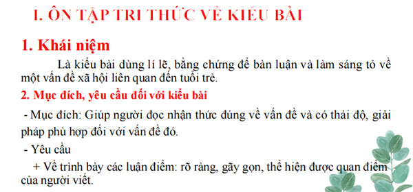 – Đặc điểm kiểu bài nghị luận về một vấn đề liên quan đến tuổi trẻ. – Cách viết bài nghị luận về một vấn đề liên quan đến tuổi trẻ. |