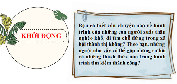 Bạn có biết câu chuyện nào về hành trình của những con người xuất thân nghèo khổ, đi tìm chỗ đứng trong xã hội thành thị không? Theo bạn, những người như vậy có thể gặp những cơ hội và những thách thức nào trong hành trình tìm kiếm thành công? B1. Chuyển giao nhiệm vụ HS xem lại sản phẩm đã chuẩn bị ở nhà, chỉnh sửa, bổ sung nếu cần, sau đó trình bày trước lớp. B2. Thực hiện nhiệm vụ HS xem lại sản phẩm, chỉnh sửa, bổ sung (nếu cần), chuẩn bị trình bày. B3. Báo cáo, thảo luận Cá nhân HS trình bày sản phẩm. Các HS khác nhận xét, bổ sung.