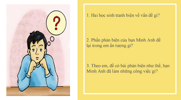- Bài phản biện của Minh Anh: sắc bén, hệ thống. - Những công việc bạn Minh Anh đã làm: + Khi nghe: tập trung, ghi chép. + Khi nói: nội dung được trình bày hệ thống, rõ quan điểm, lí lẽ sâu sắc,…. |
