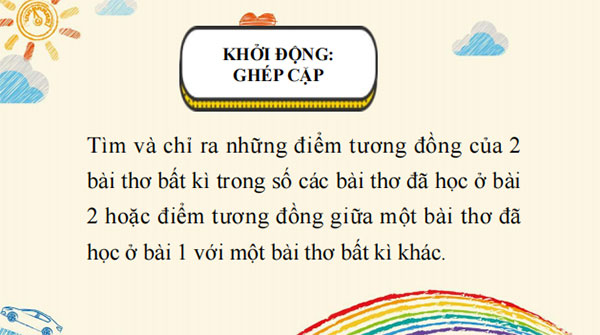 Bước 1. Chuyển giao nhiệm vụ Kĩ thuật trình bày 01 phút: Yêu cầu: Nêu tên một tác phẩm thơ mà em yêu thích (trong SGK hoặc ngoài SGK). Hãy đưa ra một vài lời đánh giá về tác phẩm thơ đó. Hãy liên hệ và so sánh với một tác phẩm thơ khác có các hình ảnh tương tự? Bước 2. Thực hiện nhiệm vụ: HS nhớ lại kiến thức, phát biểu. Bước 3. Báo cáo thảo luận: Bước 4. Đánh giá kết quả thực hiện: GV đặt ra vấn đề của bài học: Làm thế nào để so sánh, đánh giá hai tác phẩm thơ? |