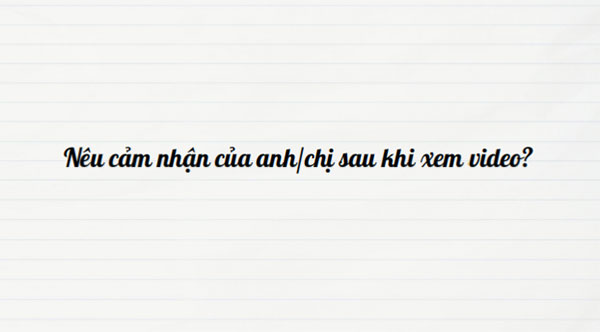 B1. Chuyển giao nhiệm vụ -GV cho Hs xem video: https://www.youtube.com/watch?v=1wr6j9S47Hc -GV phát vấn: Nêu cảm nhận của anh/chị sau khi xem video? B2. Thực hiện nhiệm vụ: - HS xem video và suy nghĩ, trả lời cá nhân B3. Báo cáo thảo luận: - HS chia sẻ suy nghĩ và chia sẻ câu trả lời. B4. Đánh giá kết quả thực hiện: -Nhận xét câu trả lời của HS, dẫn dắt để kết nối hoạt động hình thành kiến thức mới. |