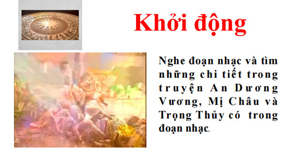 B1. Chuyển giao nhiệm vụ: Hs nghe đoạn nhạc, chỉ ra những chi tiết có trong truyện An Dương Vương, Mị Châu và Trọng Thủy có trong đoạn nhạc? GV giao nhiệm vụ cho các tổ tìm hiều về thành Cổ Loa, sưu tầm các loại hình ảnh về đồ đồng thời Âu Lạc. B2. Thực hiện nhiệm vụ: - HS lắng nghe yêu cầu từ GV, tìm hiểu để chia sẻ trước lớp B3. Báo cáo thảo luận: - GV mời đại diện HS chia sẻ trước lớp. B4. Đánh giá kết quả thực hiện: - GV nhận xét, đánh giá, khen ngợi HS. - GV dẫn vào bài học mới: Truyền thuyết An Dương Vương và Mỵ Châu- Trọng Tthủy đã để lại những dấu lịch sử quan trọng cha ông thời kì dựng nước. Những thành tựu mà nhà nước Âu Lạc đạt được – đặc biệt là kĩ thuật đúc đồng, đã trở thành cảm hứng sáng tạo, niềm tự hào của những người dân đất Việt trong quá trình dựng nước và giữ nước. |