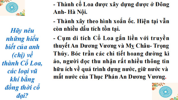 - Thành cổ Loa được xây dựng được ở Đông Anh- Hà Nội. - Thành xây theo hình xoắn ốc. Hiện tại vẫn còn nhiều dấu tích tồn tại. - Cụm di tích Cổ Loa gắn liền với truyền thuyết An Dương Vương và Mỵ Châu- Trọng Thủy. Bóc trần các chi tiết hoang đường kì ảo, người đọc thu nhận rất nhiều thông tin hữu ích về quá trình dựng nước, giữ nước và mất nước của Thục Phán An Dương Vương. - Tranh ảnh về vũ khí bằng đồng thời cổ đại