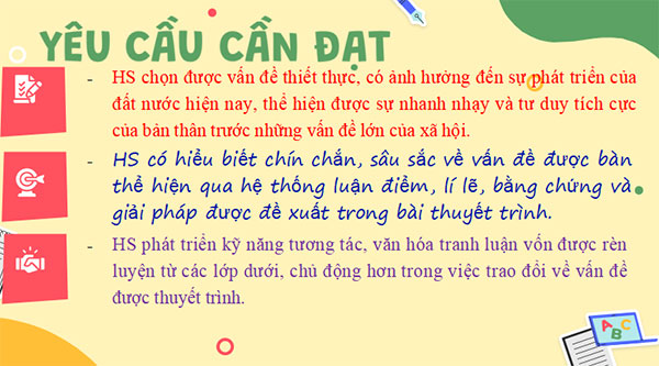 - Học sinh có những hiểu biết chín chắn, sâu sắc về những vấn đề được bàn luận thể hiện qua hệ thống luận điểm, lí lẽ, bằng chứng và các giải pháp được đề xuất trong bài thuyết trình.