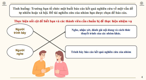 Khi tham gia buổi trao đổi, em sẽ thực hiện một trong hai nhiệm vụ ứng với từng vai cụ thể như sau: -Người trình bày: Trình bày báo cáo kết quả nghiên cứu về một vấn đề tự nhiên hoặc xã hội của nhóm. -Người nghe: Nghe và nhận xét, đánh giá nội dung, cách thức thuyết trình của các nhóm khác. |
