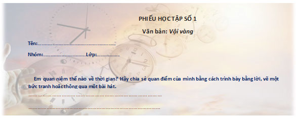 - Huy động kinh nghiệm của HS về vấn đề thời gian, liên quan đến văn bản Vội vàng của Xuân Diệu.