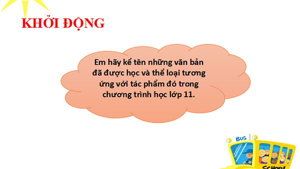 - GV tổ chức cho HS chơi trò chơi: Ai nhanh hơn?: Em hãy kể tên những thể loại và những văn bản tương ứng với các thể loại trong chương trình học Ngữ văn lớp 10, 11.