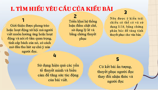 - Viết được bài văn nghị luận dưới hình thức một bài phát biểu; trình bày rõ hệ thống luận điểm, có cấu trúc chặt chẽ; mở đầu, kết thúc gây ấn tượng; sử dụng các lí lẽ, bằng chứng thuyết phục, chính xác, tin cậy; biết đặt ra các ý kiến phản bác để trao đổi, tranh luận lại; sử dụng các yếu tố thuyết minh và biểu cảm.