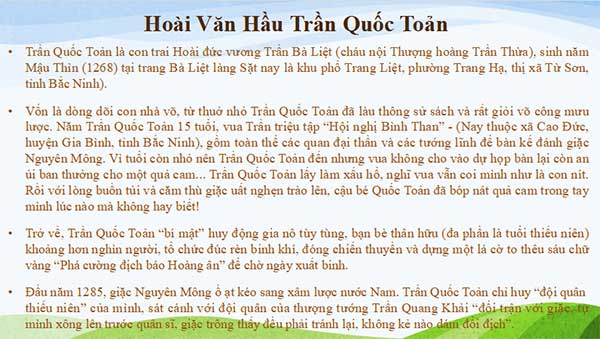 c. Sản phẩm: Chia sẻ của HS những hiểu biết về anh hùng Trần Quốc Toản (Hoài Văn)