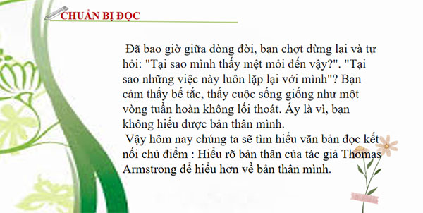 Vậy hôm nay chúng ta sẽ tìm hiểu văn bản đọc kết nối chủ điểm: “Hiểu rõ bản thân” của tác giả Thomas Armstrong để hiểu hơn về bản thân mình.