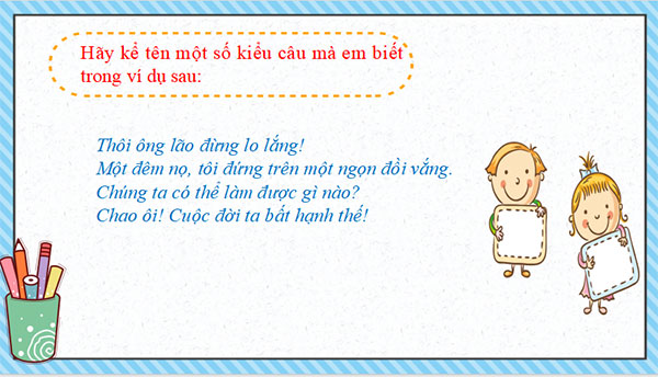 Câu 1: Hãy kể tên một số kiểu câu mà em biết trong ví dụ sau: