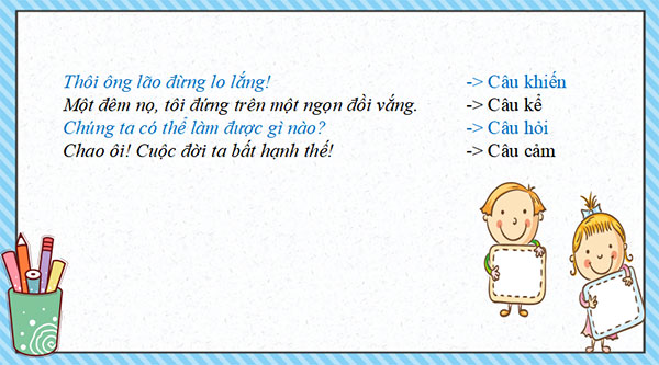 + Nhận biết và sử dụng được câu hỏi, câu khiến, câu cảm, câu kể trong hoạt động giao tiếp;