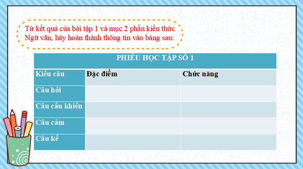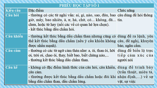 - Những đặc điểm về câu hỏi, câu khiến, câu cảm, câu kể trong hoạt động giao tiếp.
