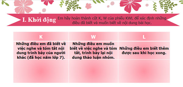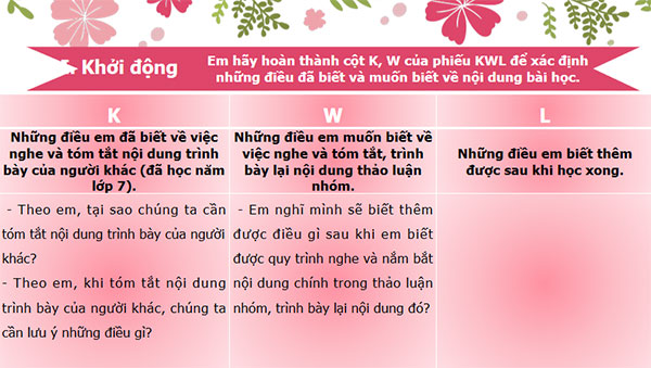 - GV đặt câu hỏi gợi mở: GV tổ chức thảo luận nhóm nhỏ về một vấn đê cần có giải pháp thống nhất bằng kĩ thuật KWL. GV có thể yêu cầu HS ghi các phần sau vào vở và điền thông tin trước.