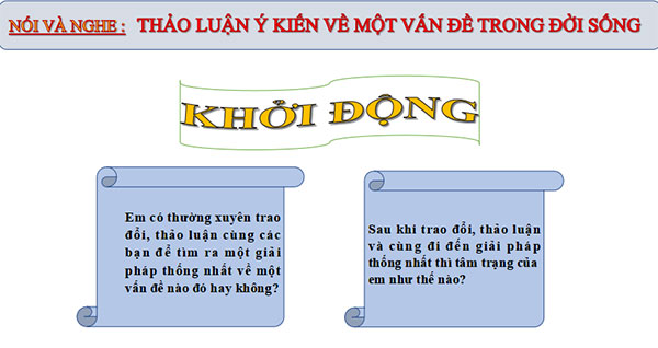 Có nhiều vấn đề trong cuộc sống. Trước vấn đề ấy, các em có thể phát biểu ý kiến, nêu lên những suy nghĩ, nhận xét; đưa ra lí lẽ và dẫn chứng cụ thể để làm sáng tỏ cho ý kiến của mình, sau đó cùng nhau trao đổi để tìm ra phương hướng giải pháp thống nhất. Tiết học hôm nay sẽ giúp các em biết cách để thảo luận ý kiến về một vấn đề trong đời sống.