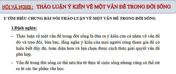 I. Tìm hiểu chung về bài nói thảo luận ý kiến về một vấn đề 1. Định nghĩa : - Thảo luận về một vấn đề trong đời sống là đưa ra ý kiến của cá nhân về vấn đề đó và trao đổi, bàn bạc, lắng nghe ý kiến của mọi người cùng tham gia để có hiểu biết đầy đủ, toàn diện hơn và lựa chọn được cách thức giải quyết vấn đề phù hợp. Vấn đề trong đời sống có thể nêu lên từ thực tế cuộc sống nhưng cũng có thể rút ra từ các tác phẩm văn học. 2. Yêu cầu chung: Để trao đổi, thảo luận về một vấn đề, các em cần chú ý: - Quan tâm , theo dõi các sự việc, hiện tượng…trong cuộc sống xung quanh hoặc suy nghĩ từ các văn bản đọc hiểu để phát hiện vấn đề có ý nghĩa. - Lựa chọn vấn đề cần trao đổi. Tìm hiểu các thông tin về vấn đề và suy nghĩ, xác định ý kiến của em về vấn đề đó. - Trao đổi, thảo luận trong nhóm về vấn đề đã lựa chọn. - Khi trao đổi, cần nêu rõ cách hiểu hoặc quan điểm của bản thân về vấn đề, đồng thời tôn trọng các ý kiến của người khác. |