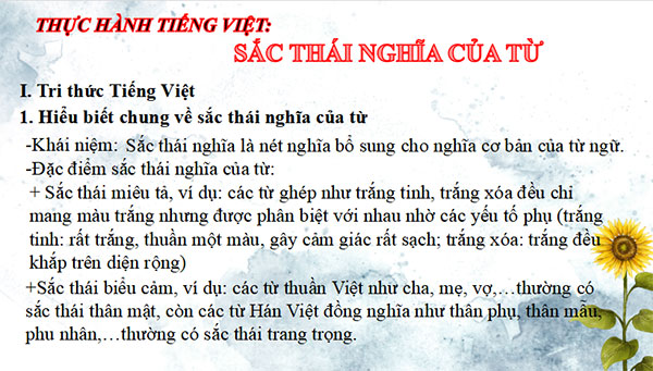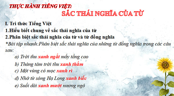 - Nhận biết được sắc thái nghĩ của từ ngữ và hiệu quả lựa chọn từ ngữ.