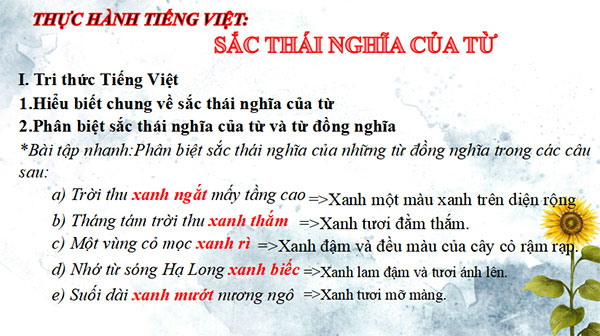 2. Phân biệt sắc thái nghĩa của từ và từ đồng nghĩa Ví dụ: Phân biệt sắc thái nghĩa của những từ đồng nghĩa trong các câu sau: a) Trời thu xanh ngắt mấy tầng cao b) Tháng tám trời thu xanh thắm c) Một vùng cỏ mọc xanh rì d) Nhớ từ sóng Hạ Long xanh biếc e) Suối dài xanh mướt nương ngô Trả lời: a) Xanh một màu xanh trên diện rộng b) Xanh tươi đằm thắm. c) Xanh đậm và đều màu của cây cỏ rậm rạp. d) Xanh lam đậm và tươi ánh lên. e) Xanh tươi mỡ màng.