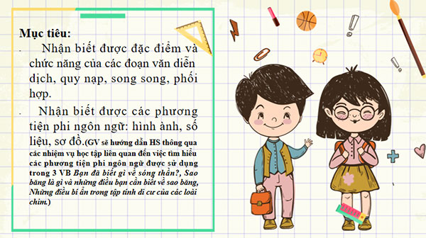 - Nhận biết được đặc điểm và chức năng của các đoạn vãn diễn dịch, quy nạp, song song, phối hợp.