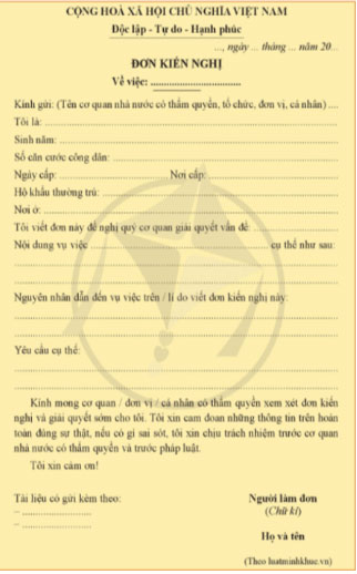 2. Yêu cầu khi viết văn bản kiến nghị về một vấn đề đời sống: a. Để viết được một văn bản kiến nghị cần lưu ý: + Tìm hiểu tình huống khi nào phải kiến nghị; kiến nghị nhằm mục đích gì, nội dung kiến nghị và cơ quan nhận kiến nghị. + Văn bản kiến nghị cần trình bày trang trọng, ngắn gọn và rõ ràng theo một số mục quy định sẵn, ví dụ, theo mẫu áp dụng chung sau đây: b. Về bố cục: Văn bản cần đảm bảo các phần sau: - Phần mở đầu: + Quốc hiệu, tiêu ngữ (ghi chính giữa) + Địa điểm, thời gian viết (ghi vào góc bên phải) + Tên VB (ghi chữ cái in hoa): ĐƠN KIẾN NGHỊ và tóm tắt sự việc kiến nghị: Về việc… (ghi chính giữa) + Người (cơ quan) nhận: Tên cơ quan nhà nước có thẩm quyền, tổ chức, đơn vị, cá nhân.. + Thông tin chính của người viết: Họ tên, Năm sinh, CCCD, địa chỉ… - Nội dung kiến nghị: Tôi viết đơn này đề nghị quý cơ quan giải quyết vấn đề…: + Nội dung vụ việc... + Lí do viế đơn kiến nghị: + Yêu cầu cụ thể: - Phần kết thúc: Lời đề nghị, cam đoan, cảm ơn; chữ kí và họ tên của người viết kiến nghị. |