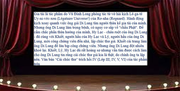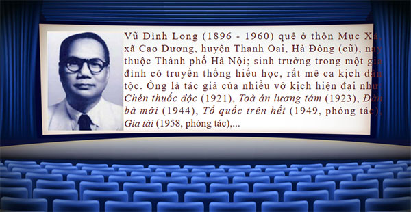 I. Tìm hiểu chung 1.Tác giả - Vũ Đình Long (1896 -1960), quê ở thôn Mục Xá, xã Cao Dương, Huyện Thanh Oai, Hà Đông (cũ) nay thuộc Hà Nội. - Ông sinh trưởng trong một gia đình có truyền thống hiếu học, rất mê ca kịch dân tộc - Ông là tác giả của nhiều vở kịch hiện đại như: Chén thuốc độc (1921), Tòa án lương tâm (1923), Đàn bà mới (1944), Tổ quốc trên hết (1949, phóng tác), Gia tài (1958, phóng tác) 2. Tác phẩm a. Thể loại: Kịch b. Xuất xứ: - Tác phẩm trích Hồi IV (Lớp thứ III, IV, V , VI ) của vởi hài kịch Gia tài In trong Tuyển tập kịch Vũ Đình Long, NXB hội nhà văn, 2009 |