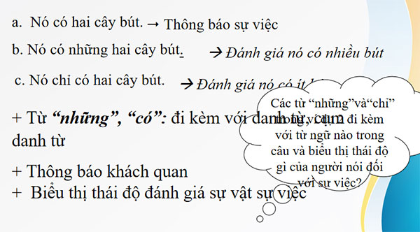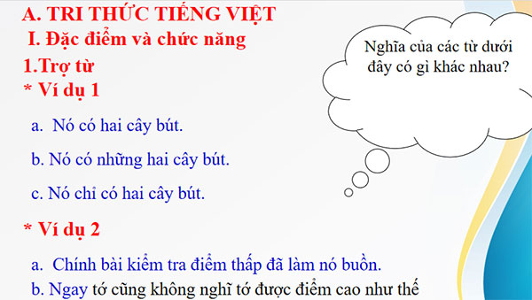 - Trợ từ là những từ chuyên dùng để nhấn mạnh hoặc biểu thị thái độ đánh giá của người nói với người nghe hoặc với sự việc được nói đến trong câu Ví dụ: những, có, chính, mỗi, đích, ngay, nhỉ, nhé, nha, nghen,... Trợ từ không có vị trí cố định trong câu, có thể chia thành 2 loại trợ từ: +Trợ từ nhấn mạnh (những, có, chính, mỗi, ngay) thường đứng trước các từ ngữ cần được nhấn mạnh. + Trợ từ tình thái (tiểu từ tính thái) (à, ạ, nhỉ, nhé, nha, nghen, đấy, này,...) thường đứng ở đầu câu hoặc cuối cuối, có tác dụng tạo kiểu câu nghi vấn , câu khiến, câu cảm thán hoặc thể hiện thái độ đánh giá, tình cảm của người nói - Thán từ là những từ dùng để bộc lộ tình cảm, cảm xúc của người nói hoặc dùng để gọi đáp. Có thể chia thành hai loại thán từ: + Thán từ bộc lộ cảm xúc (a, á, ô, ối, chà,...) dùng để bộc lộ các trạng thái tình cảm, cảm xúc (vui mừng, ngạc nhiên, đau đớn, sợ hãi,...) + Thán từ gọi đáp (ơi, dạ, vâng, ừ....) Thán từ thường đứng đầu câu và có khả năng tách ra tạo thành một câu đặc biệt. Khi sử dụng thán từ, người nói thường dùng theo ngữ điệu, cử chỉ, nét mặt tương ứng với tình cảm, cảm xúc mà thán từ biểu thị,... |