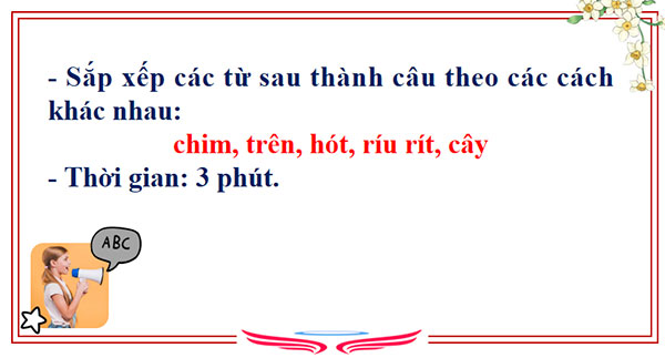 Luật chơi: Xếp các từ sau thành câu theo các cách khác nhau: chim, trên, hót, ríu rít, cây.