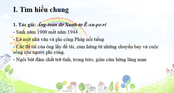 I. Tìm hiểu chung 1. Tác giả: Ăng-toan đơ Xanh-tơ Ê-xu-pe-ri - Sinh năm 1900 mất năm 1944 - Là một nhà văn và phi công Pháp nổi tiếng - Các đề tài của ông lấy đề tài, cảm hứng từ những chuyến bay và cuộc sống của người phi công. - Ngòi bút đậm chất trữ tình, trong trẻo, giàu cảm hứng lãng mạn