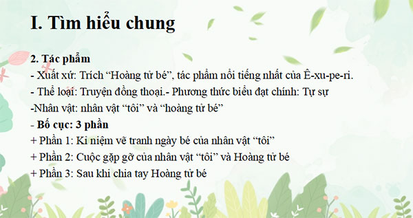2. Tác phẩm - Xuất xứ: Trích “Hoàng tử bé”, tác phẩm nổi tiếng nhất của Ê-xu-pe-ri. - Thể loại: Truyện đồng thoại. - Phương thức biểu đạt chính: Tự sự -Nhân vật: nhân vật “tôi” và “hoàng tử bé” - Bố cục: 3 phần + Phần 1: Kỉ niệm vẽ tranh ngày bé của nhân vật “tôi” + Phần 2: Cuộc gặp gỡ của nhân vật “tôi” và Hoàng tử bé + Phần 3: Sau khi chia tay Hoàng tử bé