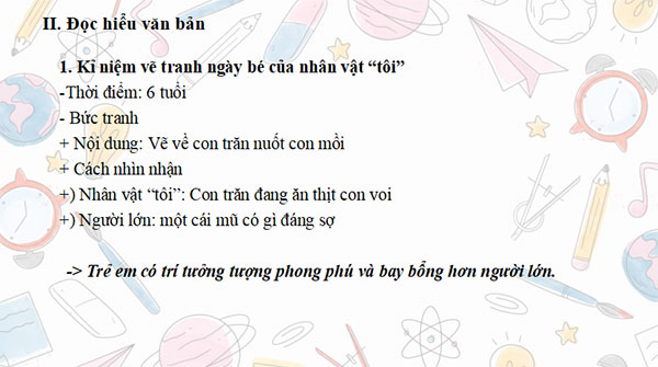 II. Đọc hiểu văn bản 1. Kỉ niệm vẽ tranh ngày bé của nhân vật “tôi” -Thời điểm: 6 tuổi - Bức tranh + Nội dung: Vẽ về con trăn nuốt con mồi + Cách nhìn nhận +) Nhân vật “tôi”: Con trăn đang ăn thịt con voi +) Người lớn: một cái mũ có gì đáng sợ -> Trẻ em có trí tưởng tượng phong phú và bay bổng hơn người lớn.