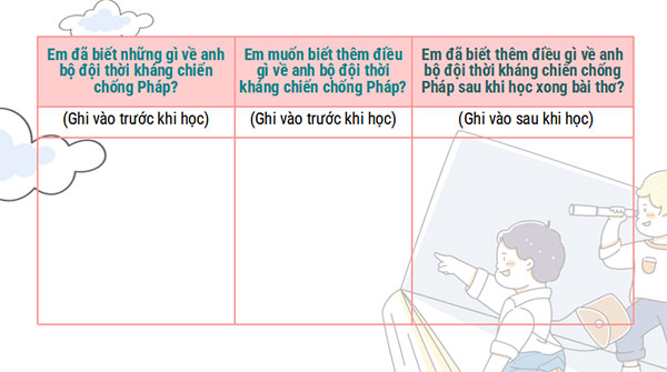 Em đã biết những gì về anh bộ đội thời kháng chiến chống Pháp? Em muốn biết thêm điều gì về anh bộ đội thời kháng chiến chống Pháp? Em đã biết thêm điều gì về anh bộ đội thời kháng chiến chống Pháp sau khi học xong bài thơ?