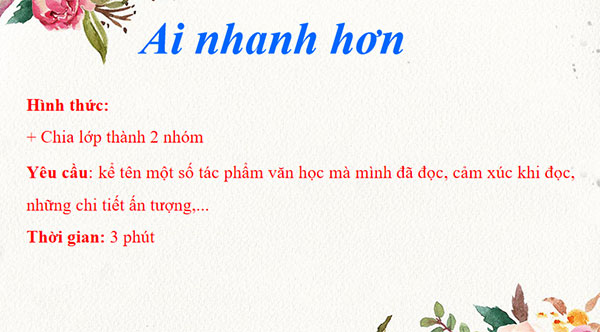 - HS chia sẻ: Về một số tác phẩm văn học mà mình đã đọc; cảm xúc khi đọc (thích thú, mới lạ, xúc động...)