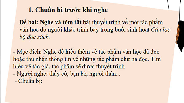 Đề bài: Nghe và tóm tắt bài thuyết trình về một tác phẩm văn học do người khác trình bày trong buổi sinh hoạt Câu lạc bộ đọc sách. 1. Chuẩn bị trước khi nghe - Mục đích: Nghe để hiểu thêm về tác phẩm văn học đã đọc hoặc thu nhận thông tin về những tác phẩm chưa đọc. Tìm hiểu về tác giả, tác phẩm sẽ được thuyết trình - Người nghe: thầy cô, bạn bè, người thân... - Chuẩn bị: (PHT số 1)