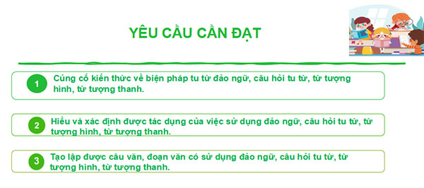 - HS nhận biết được biện pháp tu từ đảo ngữ, câu hỏi tu từ, từ tượng hình, từ tượng thanh, chỉ ra được tác dụng của chúng trong văn chương và đời sống.
