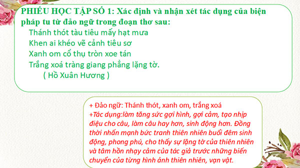 c) Sản phẩm: HS chỉ ra được biện pháp tu từ đảo ngữ, câu hỏi tu từ, từ tượng hình, từ tượng thanh. (Phiếu học tập- yêu cầu học sinh tìm hiểu trước ở nhà)