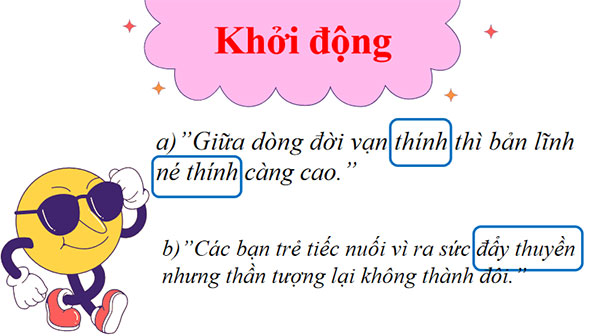 GV nhận xét, kết luận các câu trả lời của HS, giới thiệu vào bài học và nhiệm vụ học tập: Trong các ví dụ trên có một số từ mà thế hệ bố mẹ, ông bà sẽ không hiểu, đó là từ: “thính”, “né thính”, “đẩy thuyền”. Bởi các từ ngữ này của giới trẻ sử dụng, đặc biệt là trên mạng xã hội. Hôm nay cô trò ta sẽ tìm hiểu một kiến thức Tiếng việt khá thú vị. Đó là: “Biệt ngữ xã hội”.