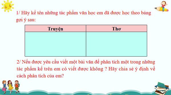 a. Mục tiêu: Khơi gợi hứng thú để học sinh kết nối vào hoạt động. b. Nội dung: 1/ Hãy kể tên những tác phẩm văn học em đã được học theo bảng gợi ý sau: