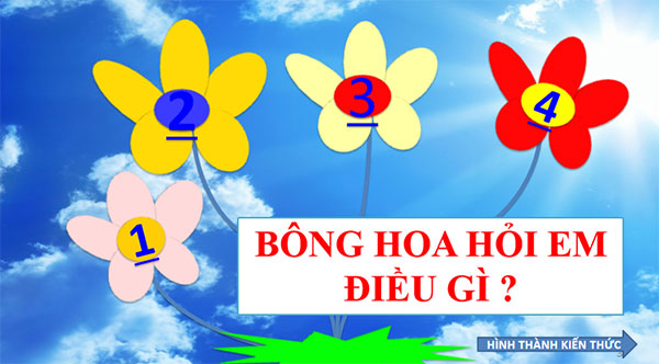 - Học sinh xung phong chọn thứ tự của từng bông hoa. Giáo viên mở yêu cầu câu hỏi. Học sinh trả lời đúng thì khen ngợi học sinh, nếu sai thì khuyến khích và cho học sinh khác tiếp sức.