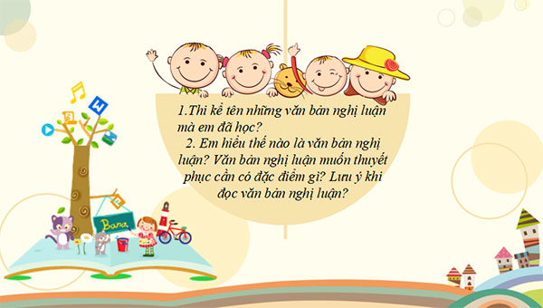 - HS nhắc lại các kiến thức đã học ở buổi trước: Em hiểu thế nào là văn bản nghị luận? Văn bản nghị luận muốn thuyết phục cần có đặc điểm gì? Lưu ý khi đọc văn bản nghị luận?