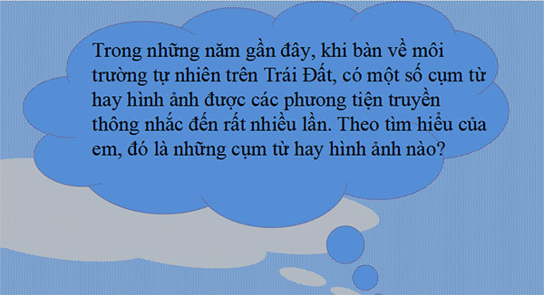 GV hỏi: Trong những năm gần đây, khi bàn về môi trường tự nhiên trên Trái Đất, có một số cụm từ hay hình ảnh được các phương tiện truyền thông nhắc đến rất nhiều lần. Theo tìm hiểu của em, đó là những cụm từ hay hình ảnh nào?