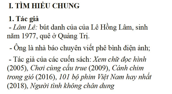 I. Tìm hiểu chung 1. Tác giả Lâm Lê: bút danh của của Lê Hồng Lâm, sinh năm 1977, quê ở Quảng Trị, là nhà báo chuyên viết phê bình điện ảnh; tác giả của các cuốn sách: Xem chữ đọc hình (2005), Chơi cùng cấu true (2009), Cánh chim trong gió (2016), 101 bộ phim Việt Nam hay nhất (2018), Người tình không chân dung (2020). 2. Đọc - tóm tắt và giải thích từ khó 3. Phương thức biểu đạt: Thuyết minh 4. Kiểu văn bản: Văn bản thông tin giới thiệu bộ phim. 5. Bố cục: 3 phần: - Phần 1 (Đoạn 1,2): giới thiệu chung vể “loạt phim”; - Phần 2 (các đoạn nằm trong để mục Rất nhiều loài đang đứng bên bờ vực tuyệt chủng): nhấn mạnh những nguy cơ đối với môi trường sống mà “loạt phim” muốn thể hiện; - Phần 3 (gồm các đoạn tiếp nối sau đề mục Nhưng vẫn chưa quá muộn: Những tín hiệu tích cực, khả quan qua 8 tập phim Hành tinh của chúng ta. |