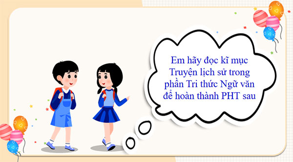 - Khái niệm bối cảnh (thời gian- không gian), cốt truyện, nhân vật, ngôn ngữ,... trong truyện lịch sử.
